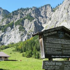 Arrived in Pertisau we take the road which leads us away from the lake. Shortly afterwards we reach the tollbooth - here the Karwendel Nature Park and the Karwendel Valleys start. Immediately after the parking space we keep to the left. The first impressions of the nature park are gorgeous: lush meadows, dense woods and the fantastic surrounding mountains. An asphalted footpath proceeds first to the Falzturn Mountain Hut (Falzturnalm, 1,089 m a.s.l.), where we arrive after about 1 hour. From here we still have half way to walk, but only 100 m in altitude are still ahead.