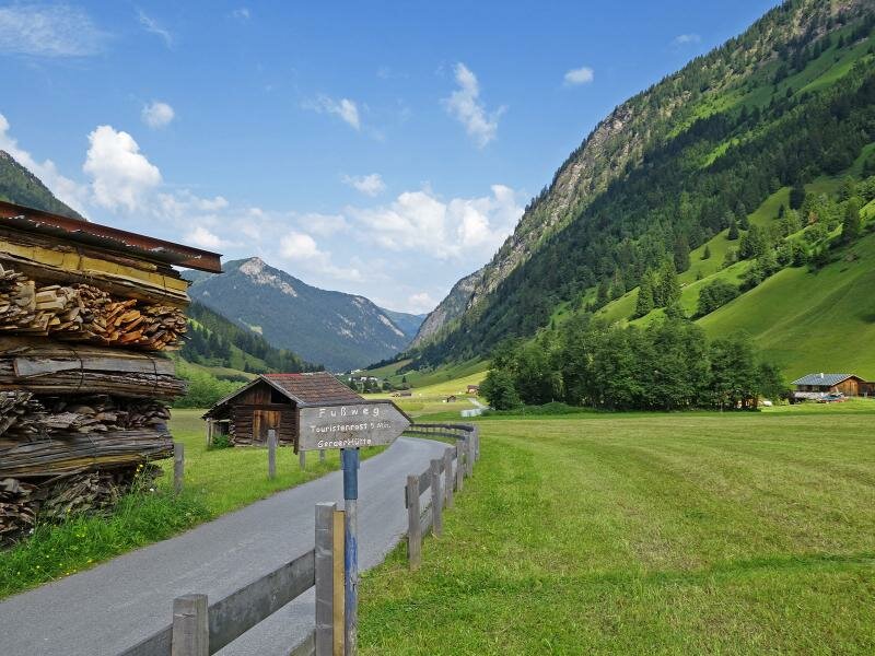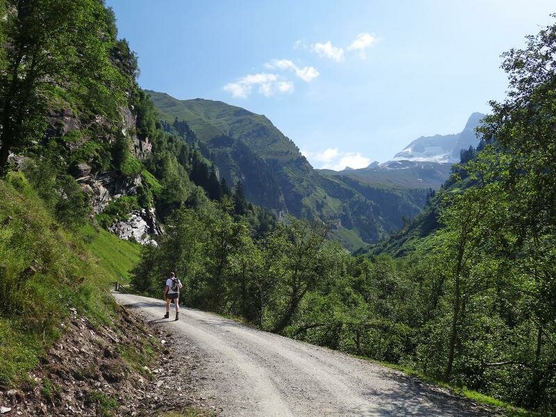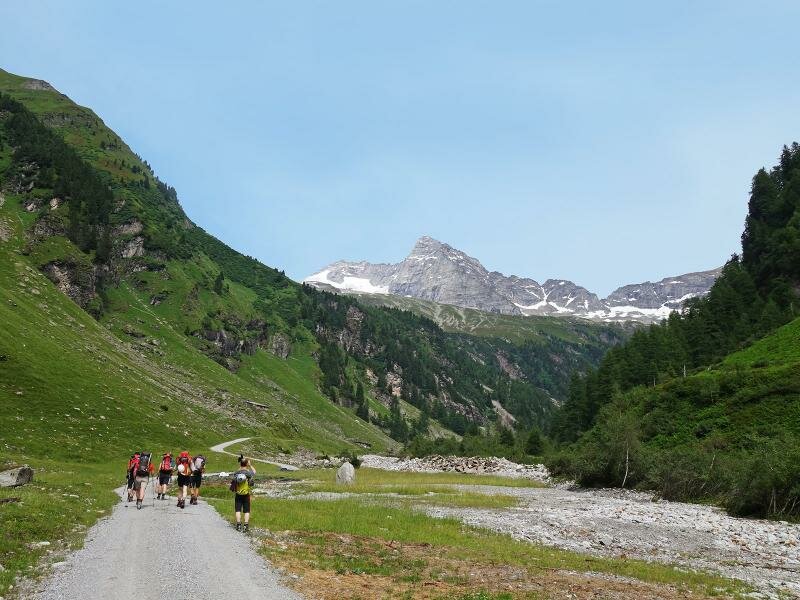 Our starting point is the parking space at the Nocker mountain hut in Innervals (head of the Valsertal valley). We pass the Touristenrast tavern and walk along the forest road into the valley. It is a idyllic green valley, from the rocks little waterfalls cascade and in the background the peaks of Mt Fussstein and Mt Olperer are visible.