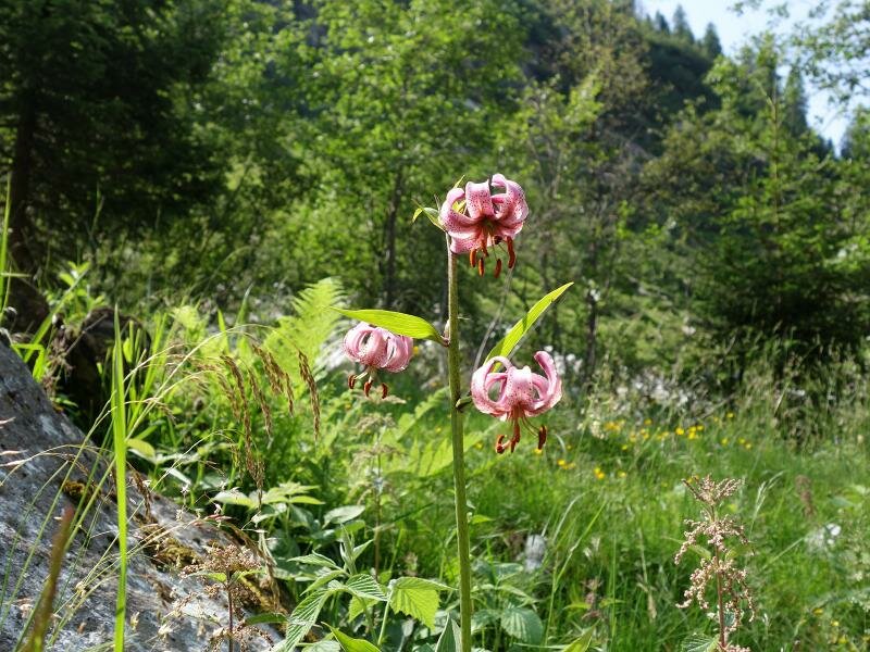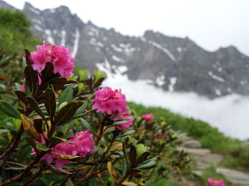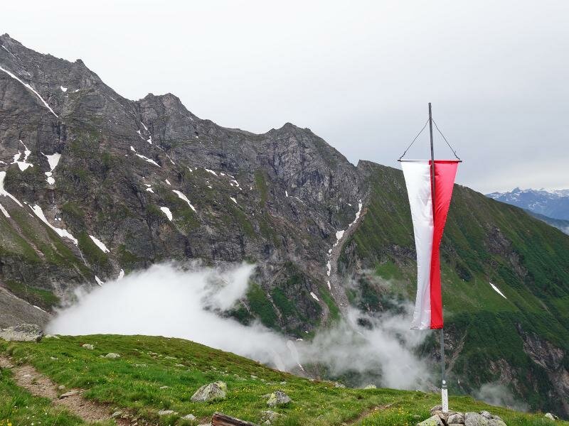 The path ascends to 1,650 m asl and proceeds past the St Valentine chapel (Valentinskapelle) to the valley station of the goods cable lift. Here the forest road ends and we follow the trail with the n° 502 which proceeds uphill along the hill. To our surprise the weather changes suddenly, clouds appear and first raindrops fall. Fortunately we are already at the Ochsenalm pasture (2,100 m asl) which is surrounded by a sea of alpine roses.