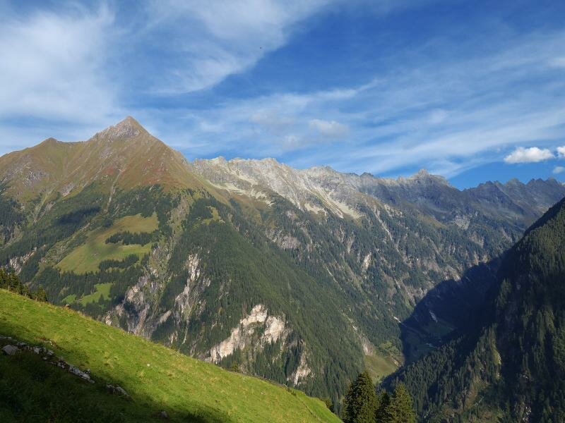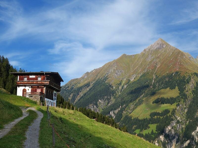 This hike leads through the forests of Ginzling in the Zemmtal, a side valley of the Zillertal, to Innerböden and on to the Oberbödenalm Alp, with view on the steep peaks of the Floitenkamm crest.
