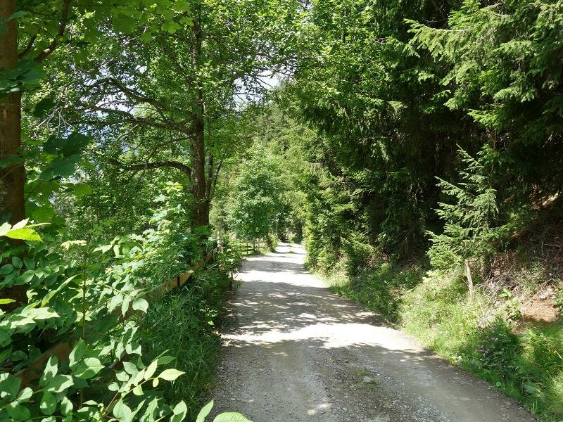 The best starting point for our hike from Alpbach to the Schatzberg is Rossmoos, a hamlet at the upper Alpbach High Route. Thus one saves about 1.5 km distance on the asphalt road. Following the signposts, you can either take the direct hiking trail or the more leisurely forest road up to the Schatzberg. For the second possibility you have to walk about 300 m further towards south, where the road branches off to the Schatzberg at the level of the Stolzenberg Farm. The meadow landscape soon gives way to the forested slope.