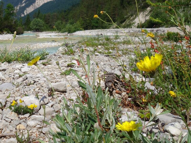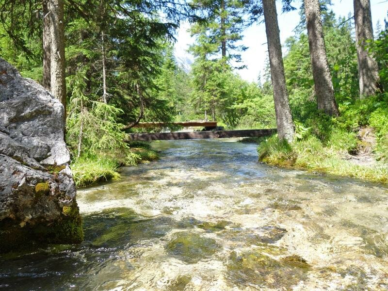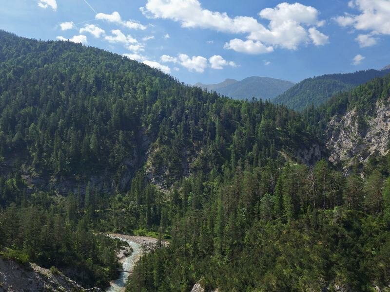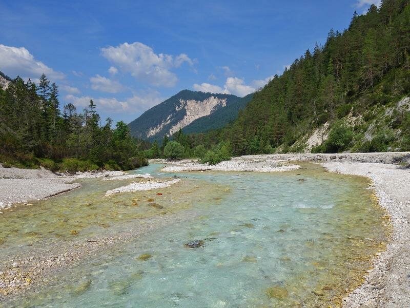 Today we’d like to discover the source of the Isar river, where the crystal clear water is shimmering in turquoise colourations on the pebble. We start our hike at the parking space near the Wiesenhof tavern at the entrance of the Hinterautal valley (municipality of Scharnitz). A wide and mostly flat hiking and cycling path enters the valley, accompanied by the murmur of the Isar river. After a hike of 10 km in the Karwendel Alpine Park, the largest nature park of Austria, the valley opens up.