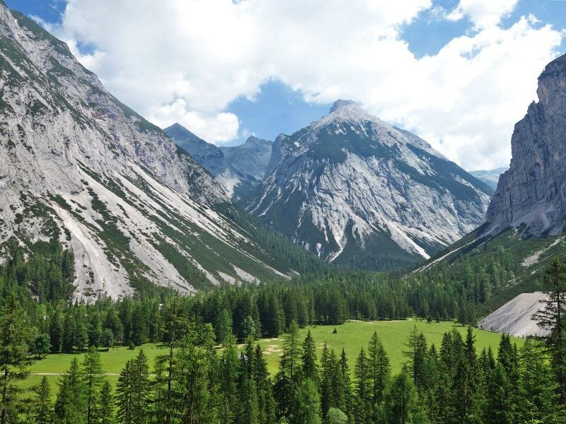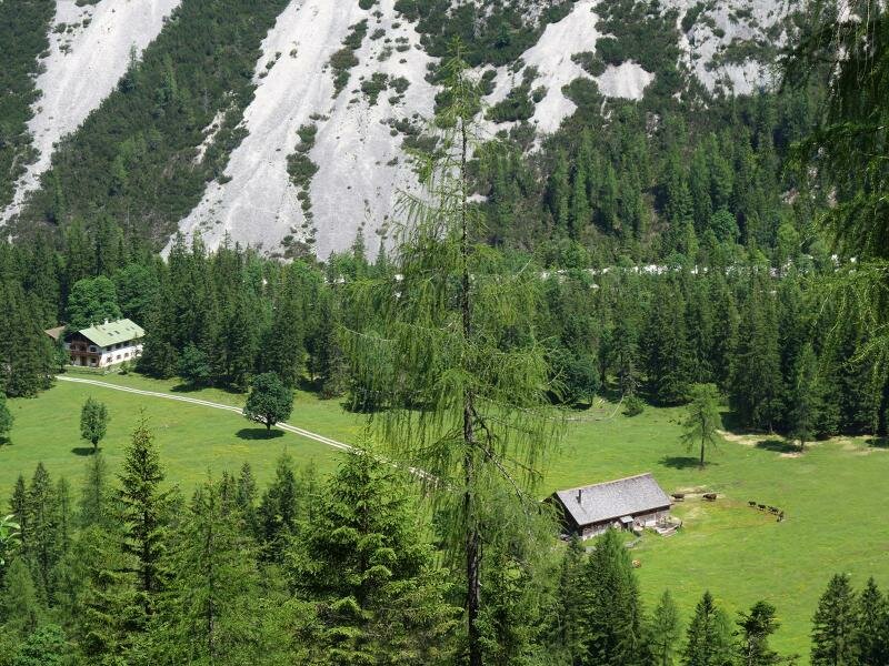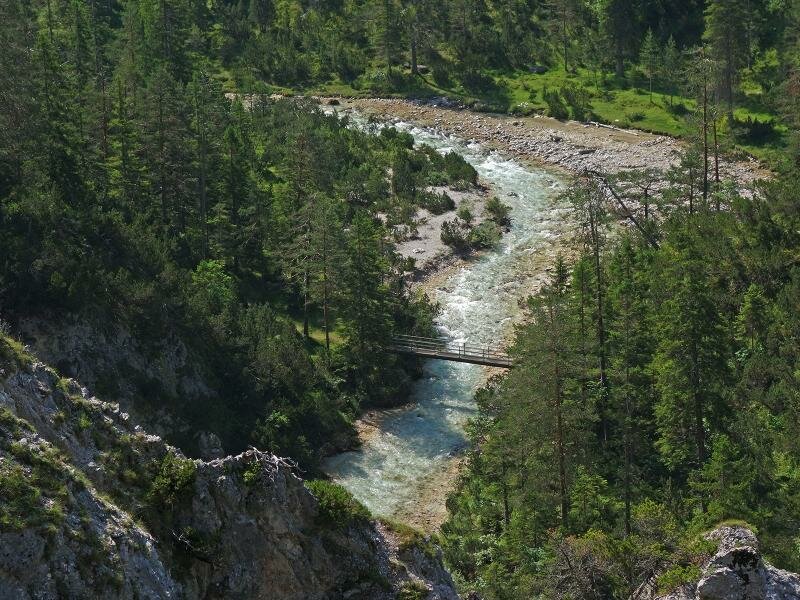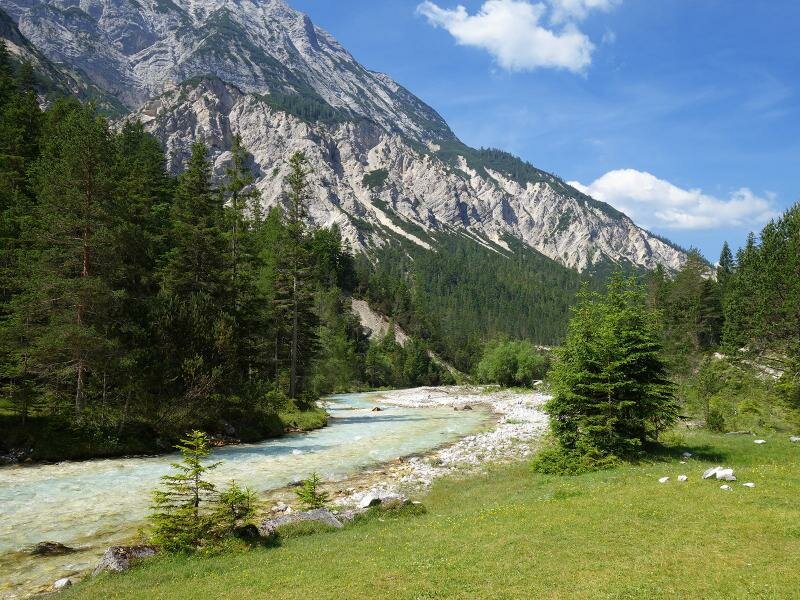 The source area of the Isar river can be found in the Hinterautal valley in the Tyrolean Karwendel Mountains. Beautiful wide paths lead us from Scharnitz through the gently rising valley.