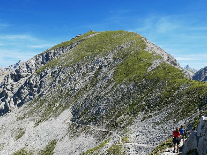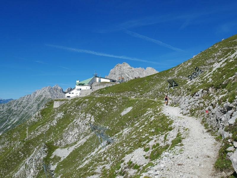 From the Hafelekar mountain station near Innsbruck, a path proceeds via the 2,315 m high Mandlscharte to the Pfeishütte hut.