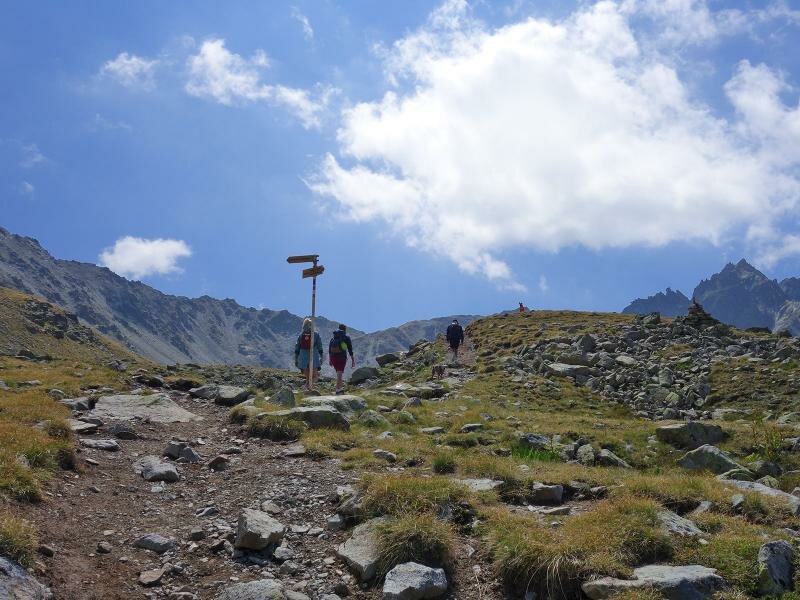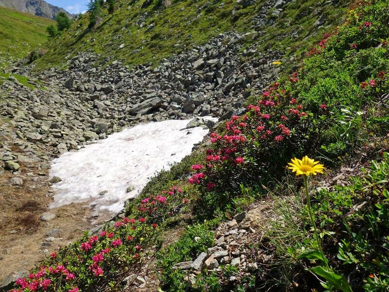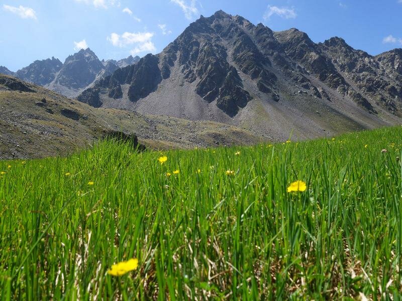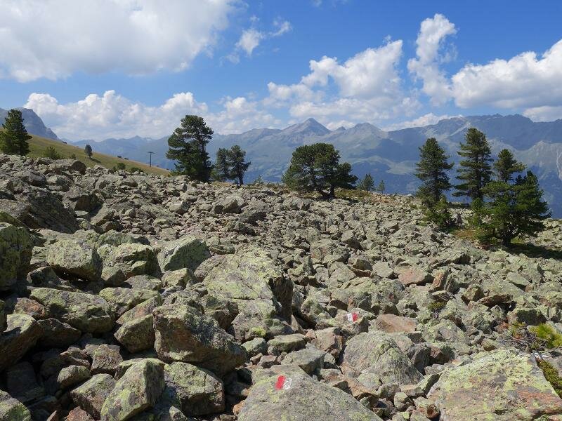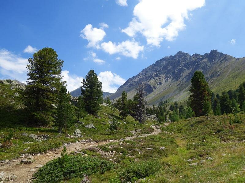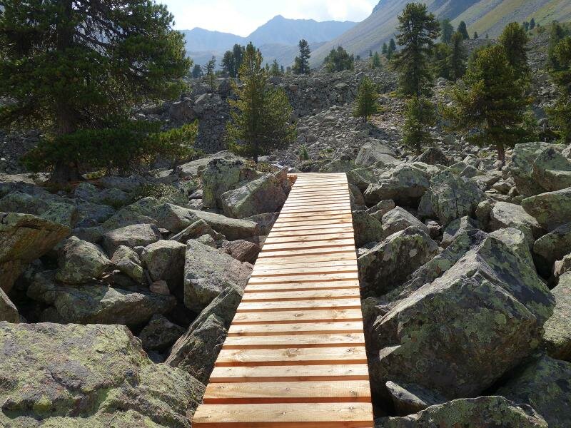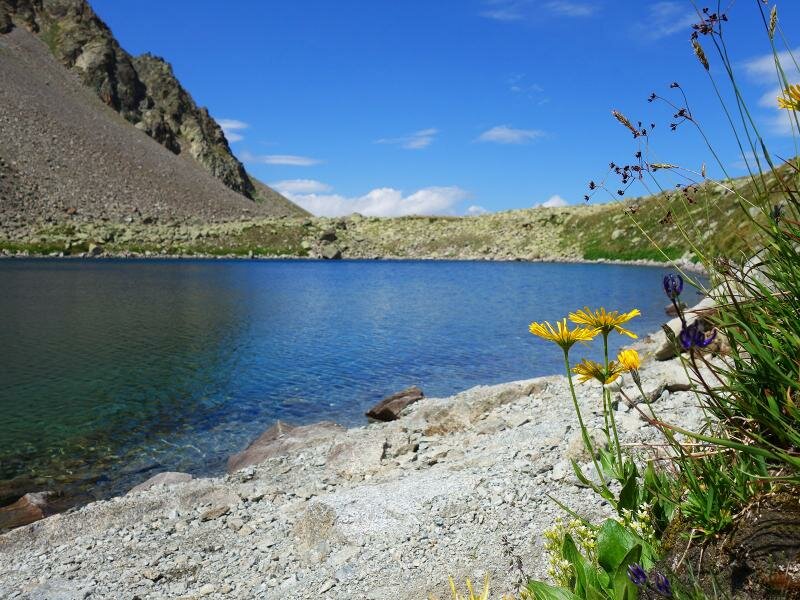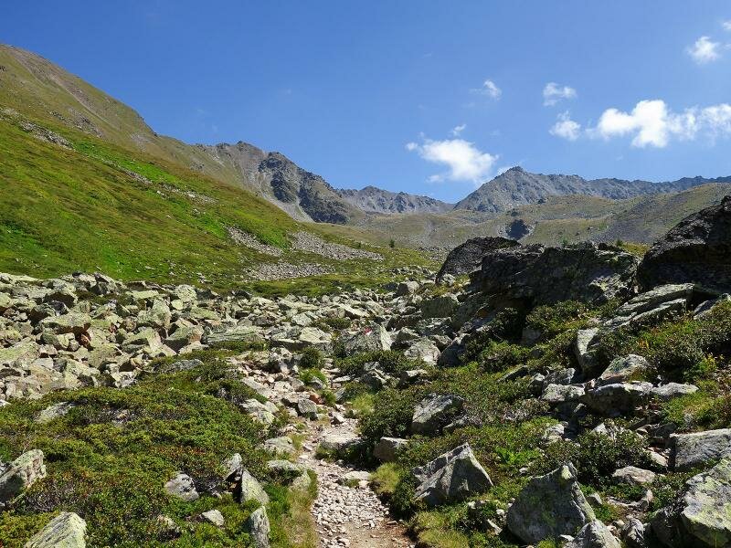 The path leads through the valley called “Ganderbild”, alternately through scree fields and high alpine heathland. The terrain is wild and untouched, characterised by the harsh conditions on the main Alpine ridge. The rather short tour (4 km in each direction and less than 500 meters in altitude) is a bit more strenuous than similarly long tours due to the often stony terrain. Especially the last section at the lakes, particularly to the upper Goldsee lake, requires easy climbing through scree fields and over rocks. You are rewarded with the view on the deep blue lakes in the bleak landscape beneath the Bergkastel. For our way back we take the same route.