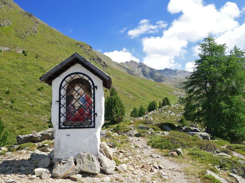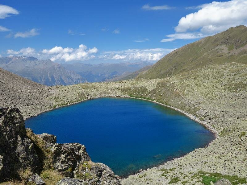 The Goldseen lakes, two deep blue high alpine waters, are located in a stone and scree desert straight on the main Alpine ridge at approx. 2,600 m a.s.l. beneath the Bergkastelspitze mountain on the Passo di Resia. The Bergkastel Cable Car take us up to 2,175 m a.s.l. Here, at the timber line, we follow the hiking path no. 33 and then no. 20 (Goldseen).