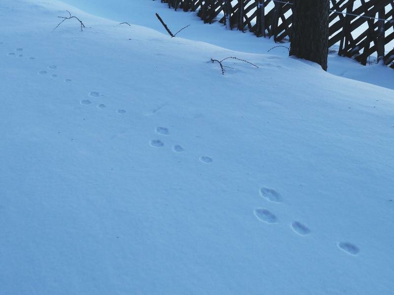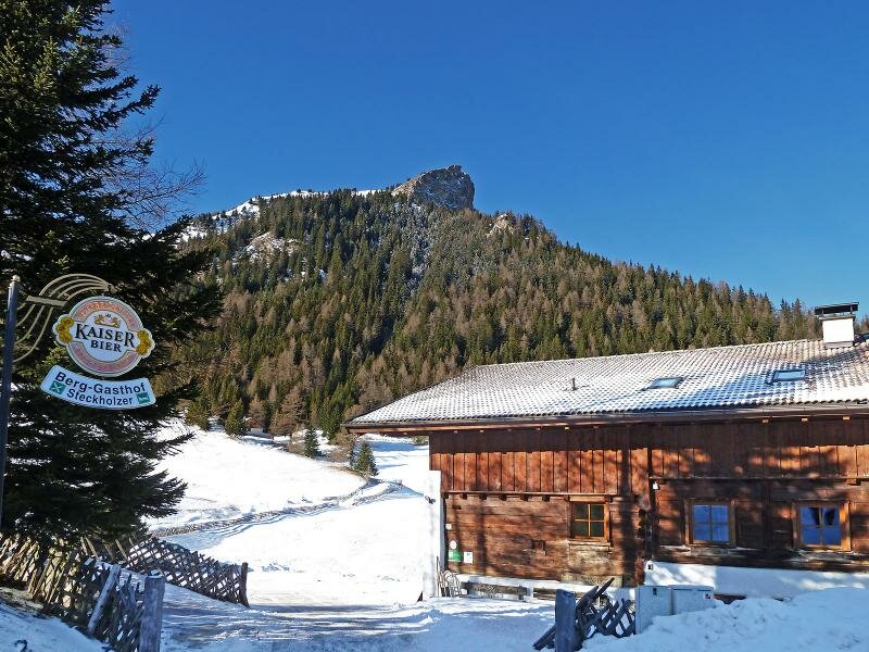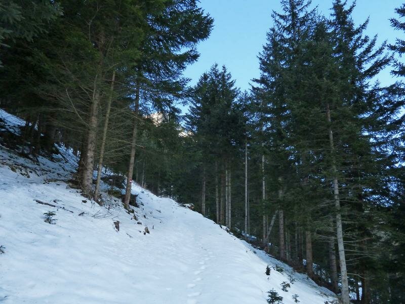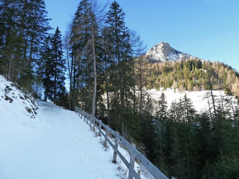 The path proceeds up the steep hill, today it is no problem to manage it with winter proofed walking boots, because there is not much snow. About 280 metres in altitude we have to overcome until we reach the top, where the path leads to the asphalt road. Near the Steckholzer tavern we reach the sunny plateau, where a few farms are located.