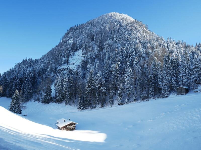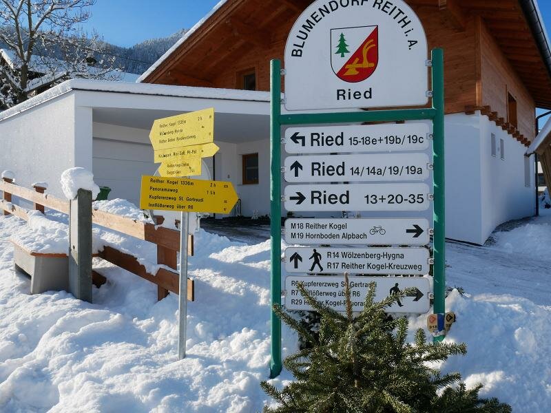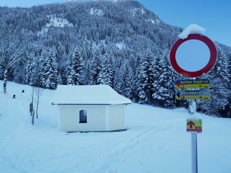 The forest road from Reith im Alpbachtal to the Nisslhof mountain inn at Mt. Reither Kogel is a popular MTB track in summer and a nice sledge run and panorama track in winter. We start in the village centre of Reith, follow the path to Ried and take then path no. R29 (Panoramaweg Reither Kogel) which proceeds past a chapel uphill through the forest.
